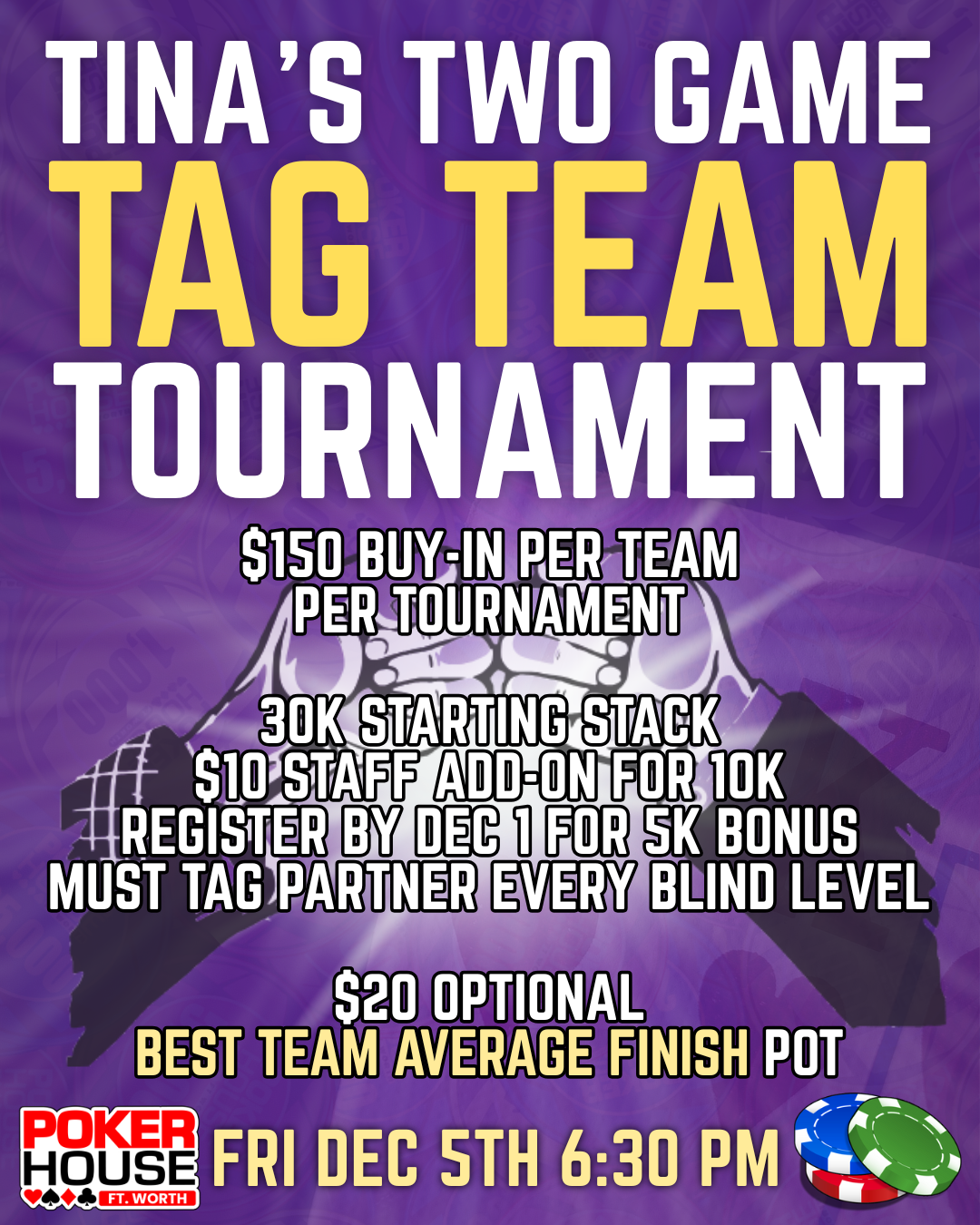 Introducing the ALL-NEW action-packed TINA's TWO GAME TAG TEAM TOURNAMENT!! Join us Dec. 5th for some seat-swapping fun!!